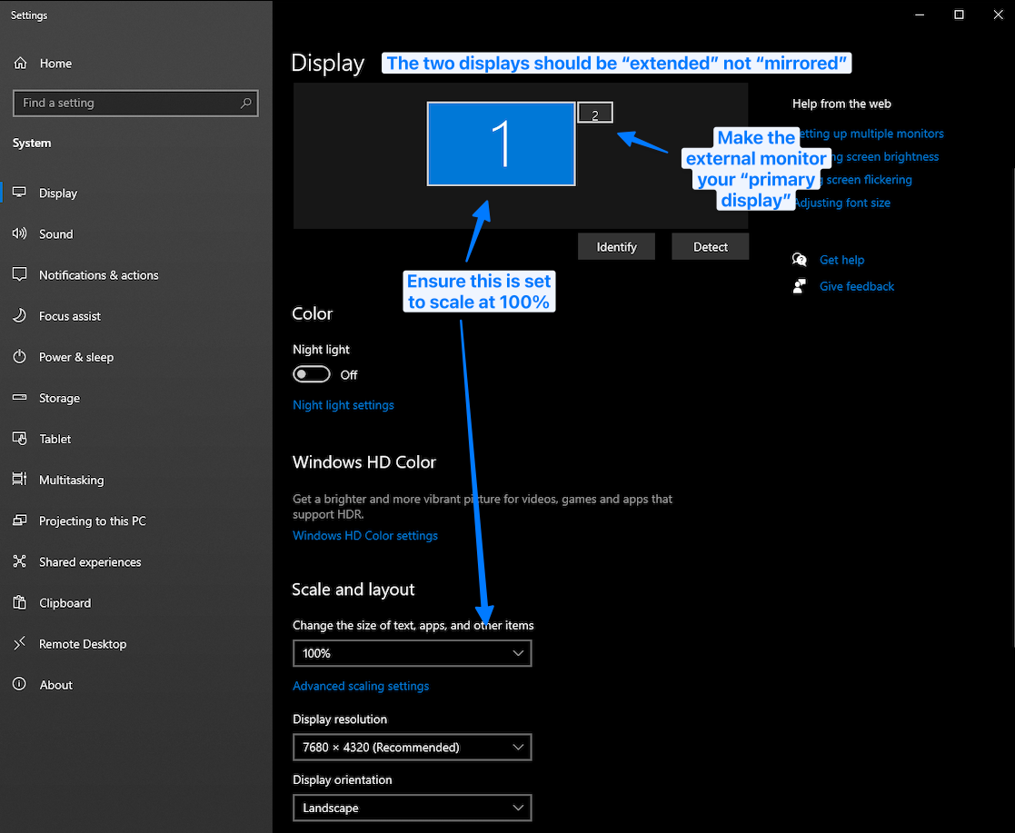 When setting up your Looking Glass 65" display alongside your secondary monitor (recommended) to use as the UI screen, ensure the following: