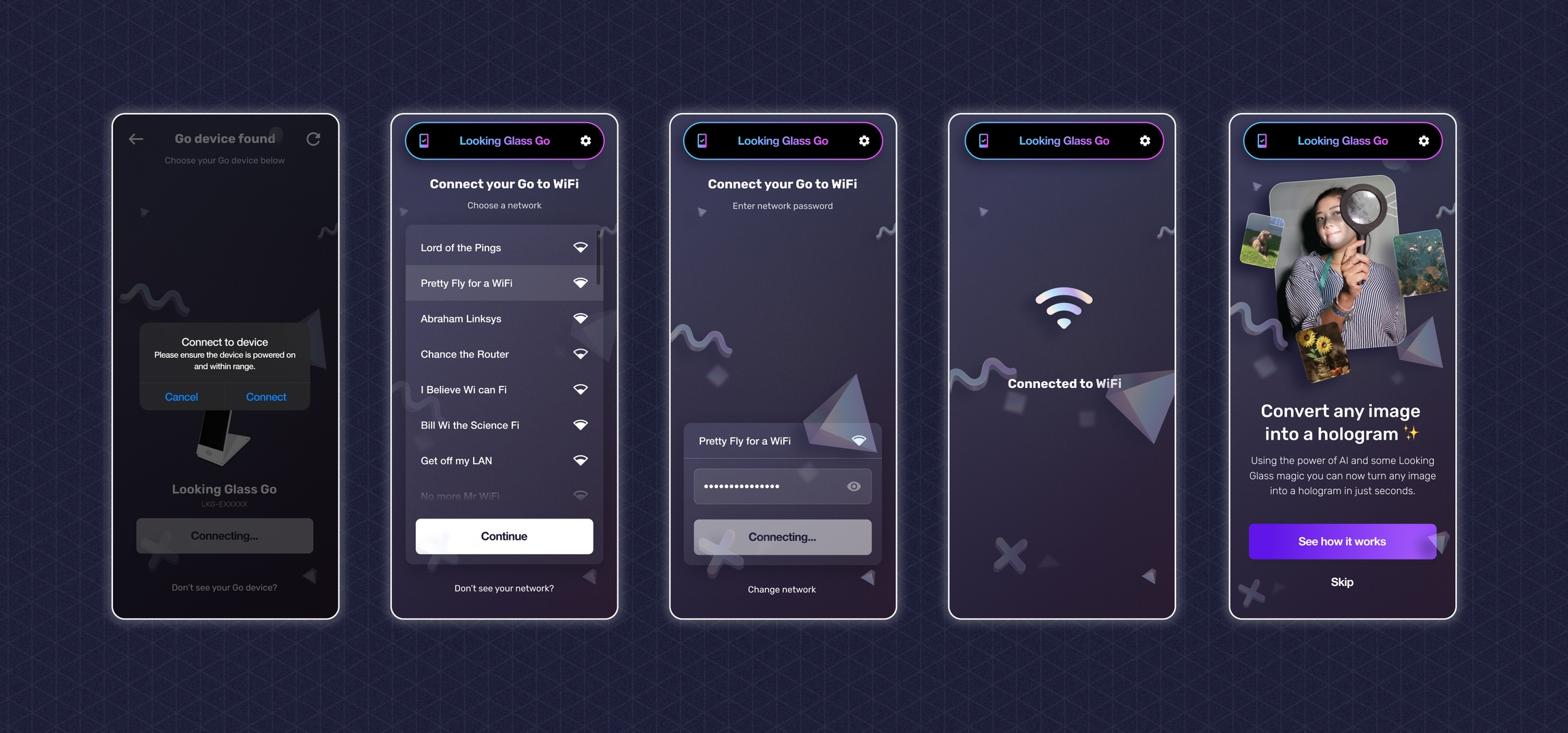 Once you've downloaded the Mobile App, follow the on-screen instructions to connect your Looking Glass Go to WiFi.