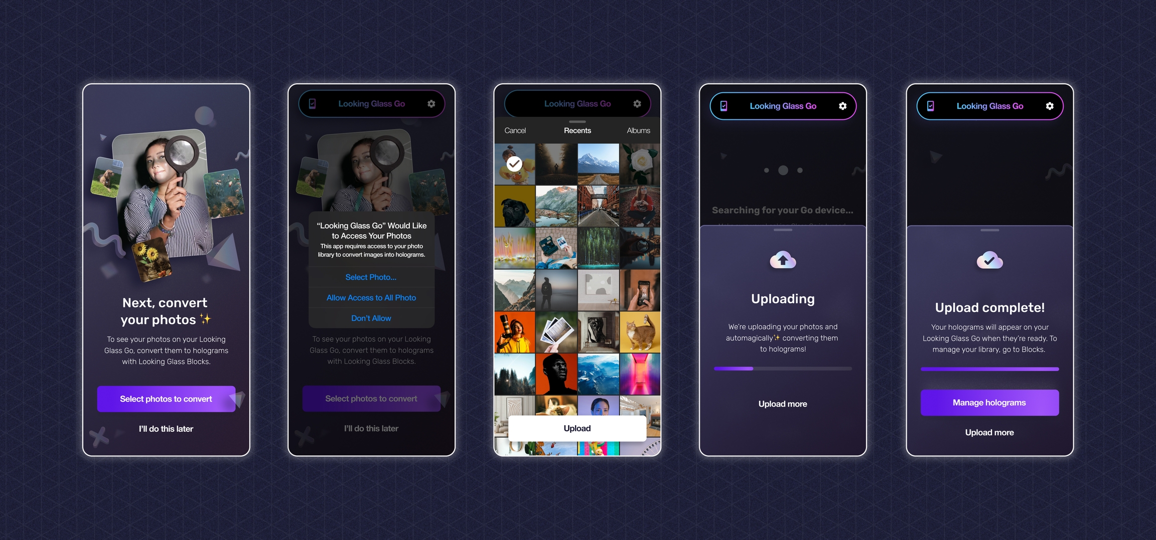 Once you are connected to your Looking Glass account and WiFi, you can start uploading new holograms to your Looking Glass Go using the mobile app.