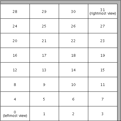 Each tile in the quilt is a conventional 2D image of a scene. The bottom-left tile of the quilt (view 0) is the leftmost view of the scene, and the top-right tile is the rightmost, like so: