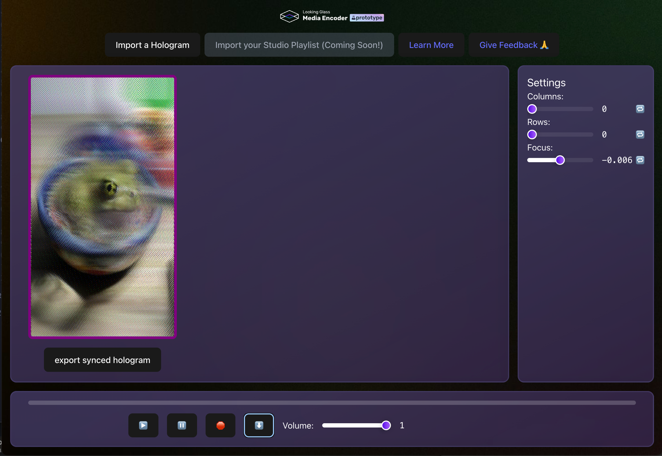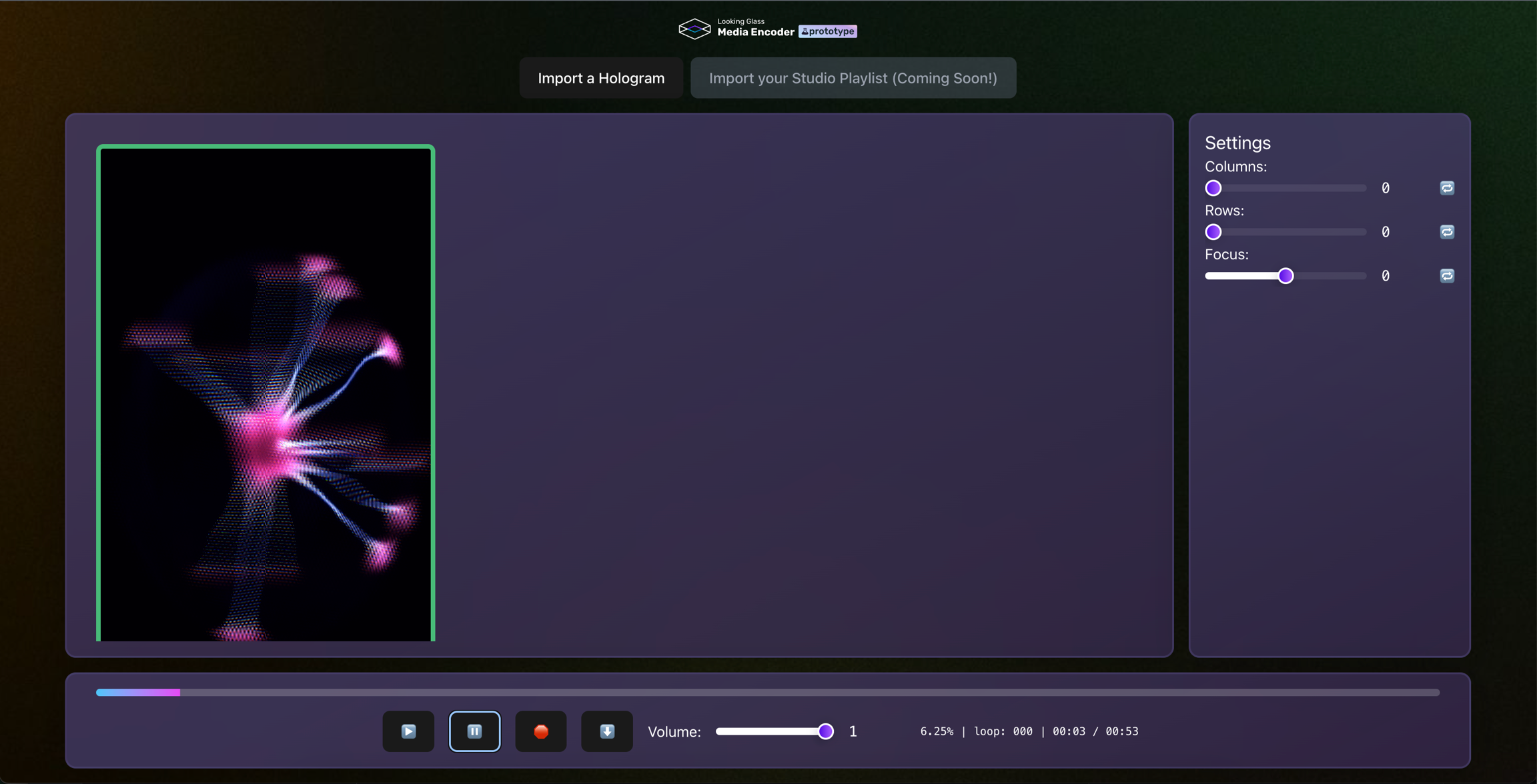 Looking Glass Media Encoder is a web based application that leverages WebCodecs and WebGPU to render hardware-accelerated image and video content on your Looking Glass display.