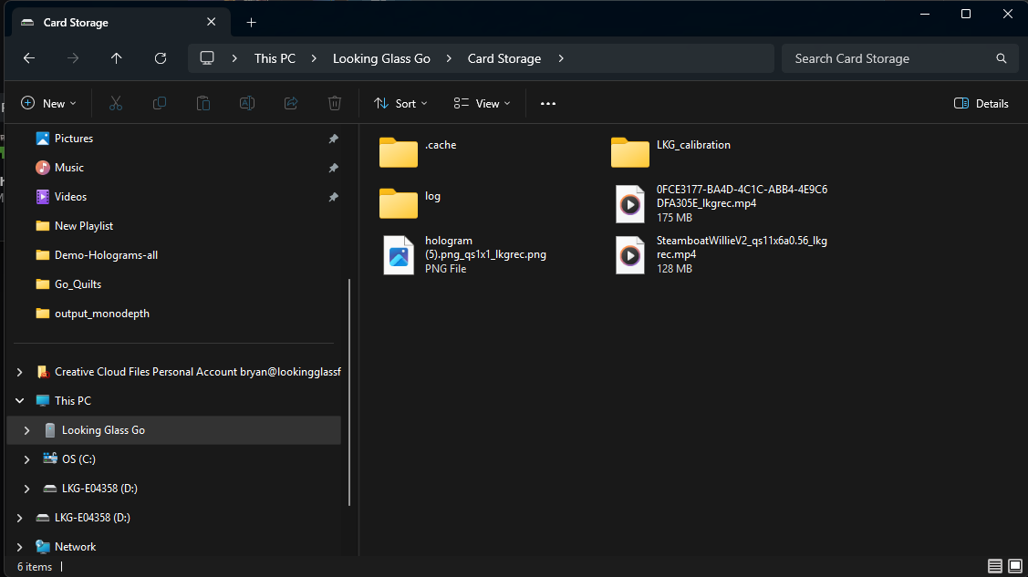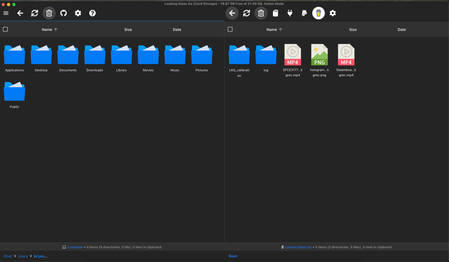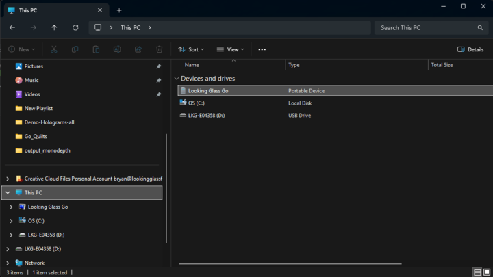 The Looking Glass Go uses a file transfer system called Media Transfer Protocol (MTP). This is the same protocol used by most media players, and prevents the device from simultaneously editing content that a connected computer is also editing. MTP makes accessing the Go's storage a bit different than a normal USB drive.