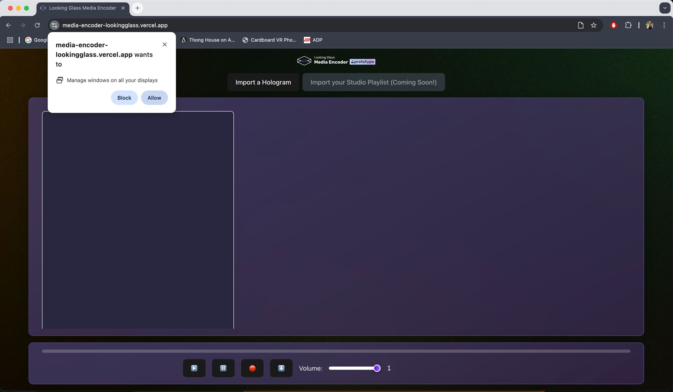 The first time you import a hologram you'll be prompted to allow Chrome to manage windows on your displays. Choose "Allow" to enable Chrome to open a window on your Looking Glass.