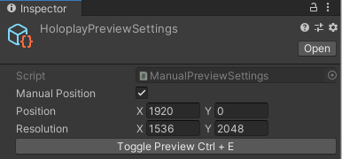 Once you've created the Hologram Camera Preview Settings you can check "Manual Position" and then modify the X and Y position. 0,0 is the bottom left of your main monitor. If your Looking Glass display is located to the right of an HD (1920x1080) monitor then the X and Y position would be 1920, 0. Since you're shifting it 1920 pixels to the right, and 0 pixels up or down. If your monitor is to the left of your main monitor, the X offset would be negative resolution of the looking glass display. For a Portrait, that would be -1536.