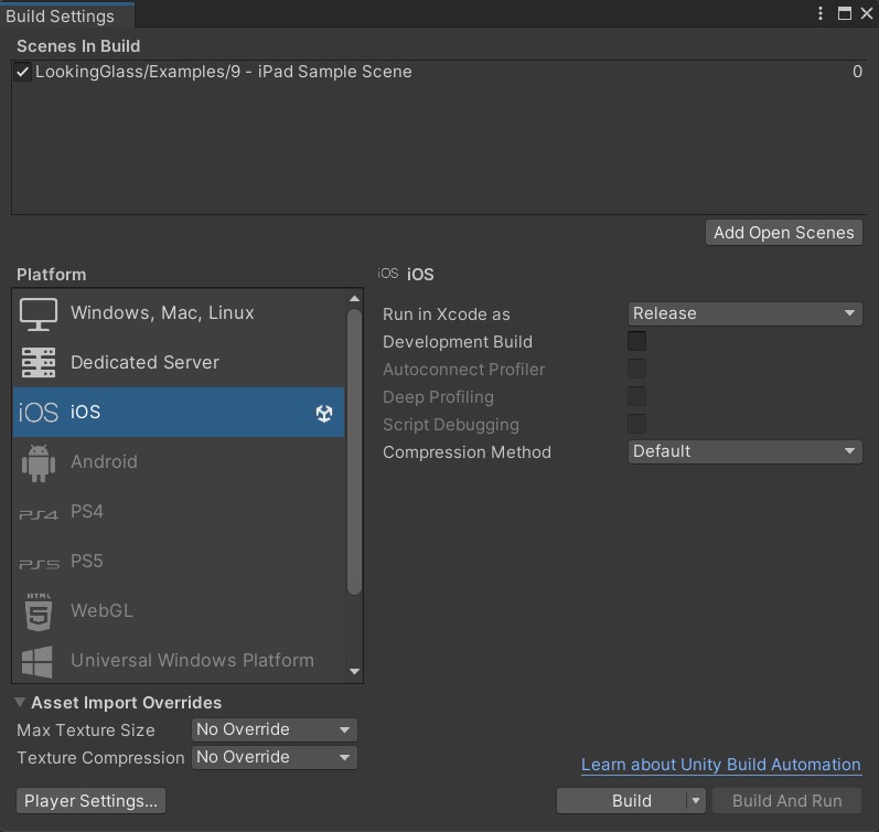 Our Looking Glass Unity plugin is built to be compatible with Unity's standard iOS build system.