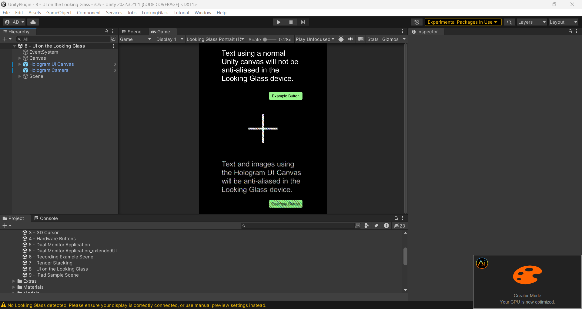 This example shows how to show text on a Looking Glass holographic display, in particular setting up the canvas. In general, it's preferable to put text and other UI elements on a 2D display next to the Looking Glass, however in v3.2.0 of the plugin we improved text rendering on the device.