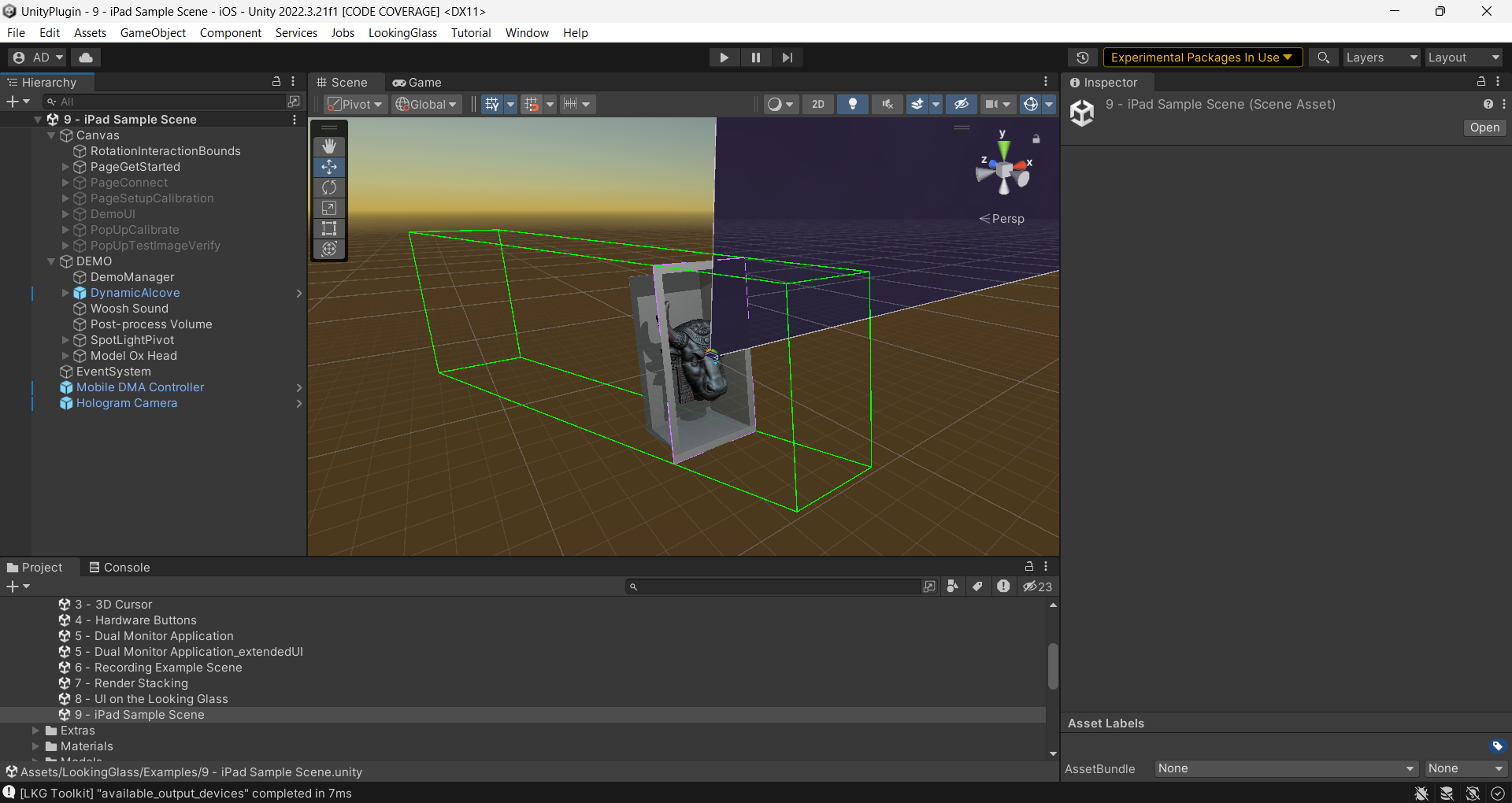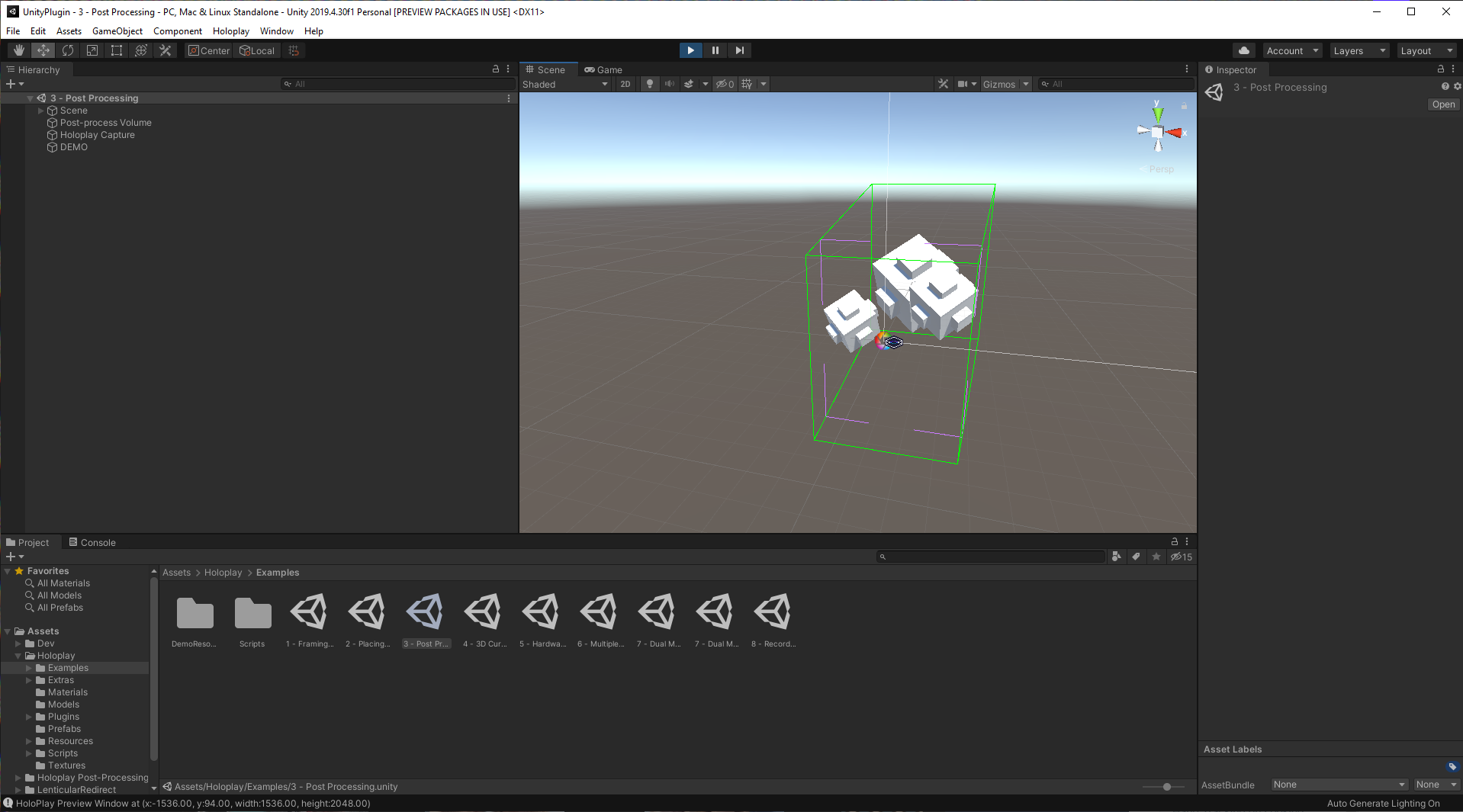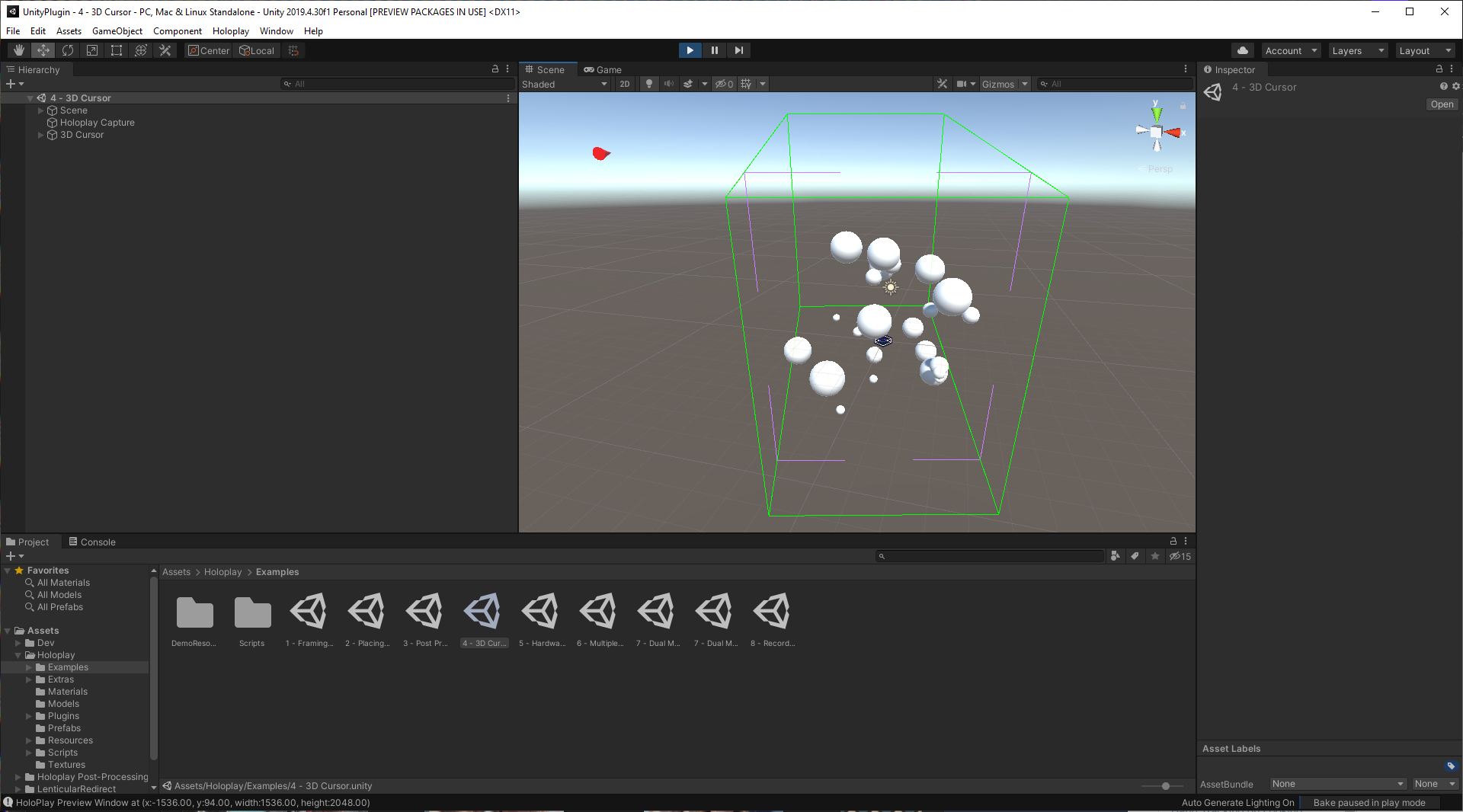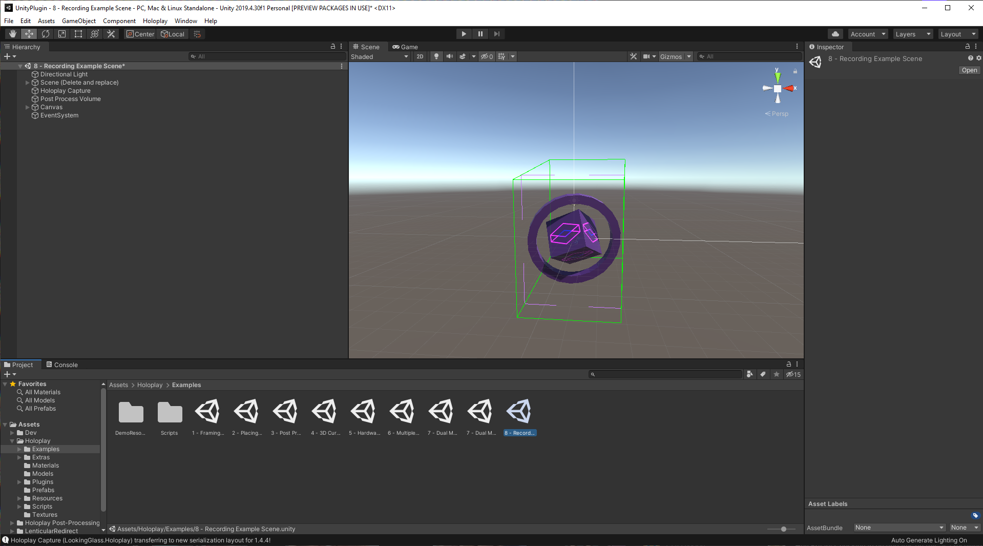 This example shows how to make use of the Hologram Camera Render Stack feature — a way to layer different kinds of content (2D camera views, 2D textures, pre-rendered quilts, and hologram camera views). You can also use this to optimize scene rendering by pre-rendering expensive background content ahead of time.