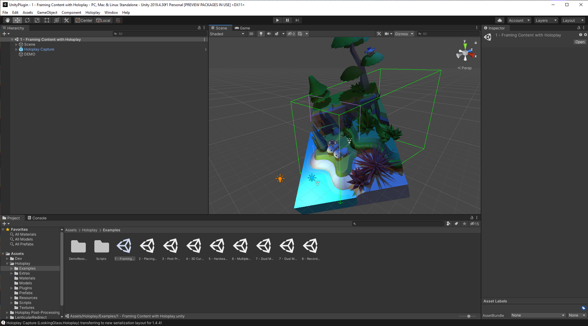 There are multiple examples in the Assets/LookingGlass/Examples folder that can help you get started with the Looking Glass Unity Plugin.
