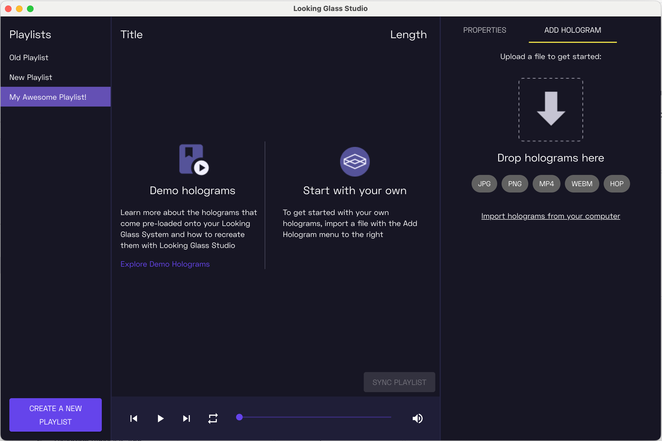 Syncing will replace the default holograms with a new playlist based on the holograms you put together in Looking Glass Studio. If you'd like your content to play alongside the demo content without resyncing the demo holograms, see the instructions on how to do that here.