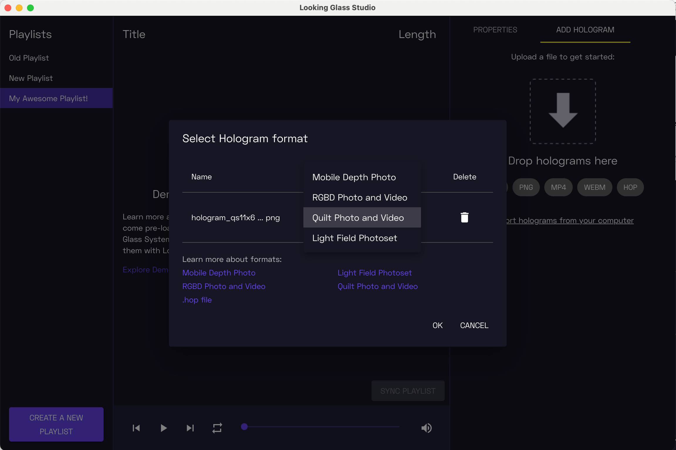 Once you've dropped your file, you'll be prompted to choose the type of hologram and select "OK".