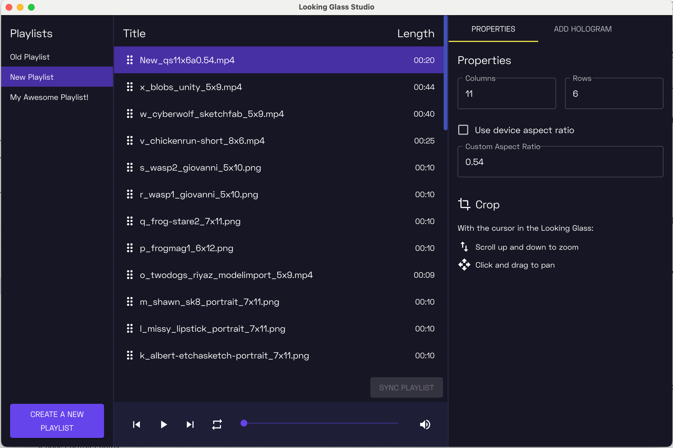 The middle panel of the application is the Playlist Panel, which lists the holograms that are to play on your Looking Glass display.