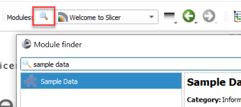 First, in 3D Slicer search for the "Sample Data" module by clicking on the magnifying glass in the Modules panel.