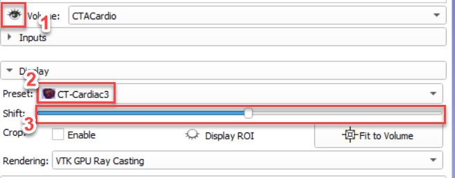 Inside the Volume Rendering module, with your dataset selected in the "Volume" field, (1) select the eye tool. Then (2) change to a preset relevant to your data. Lastly, (3) adjust the shift so you can see the most of the model. NOTE Rendering should stay on GPU (not CPU) rendering.